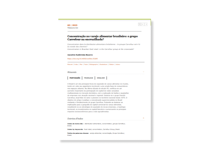 BEZERRA, JUSCELINO EUDÂMIDAS. Concentração no varejo alimentar brasileiro: o grupo Carrefour na encruzilhada?. CONFINS (PARIS), v. 1, p. 1-15, 2023.