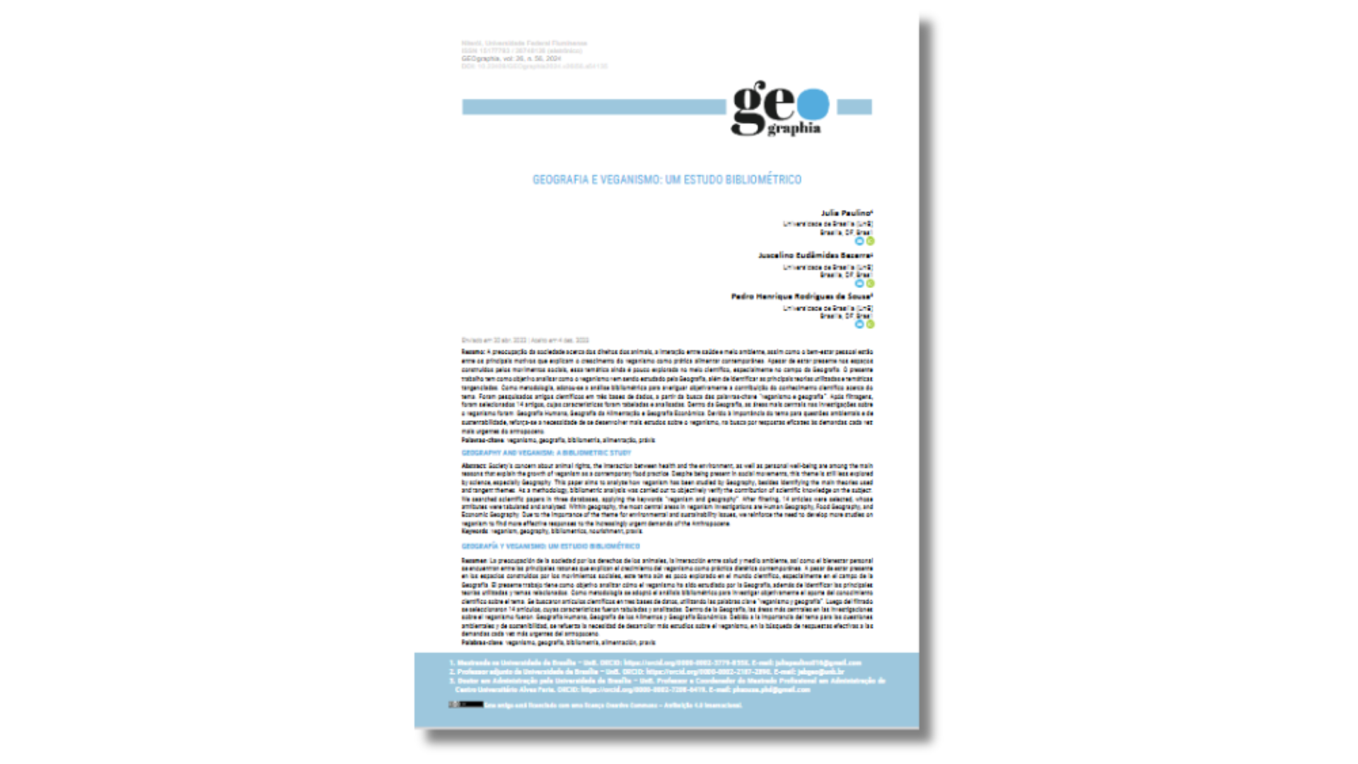 PAULINO, J. ; BEZERRA, Juscelino Eudâmidas ; SOUSA, P. H. R. . Geografia e Veganismo: um estudo bibliométrico. GEOGRAPHIA (UFF) , v. 26, p. 1-15, 2024.