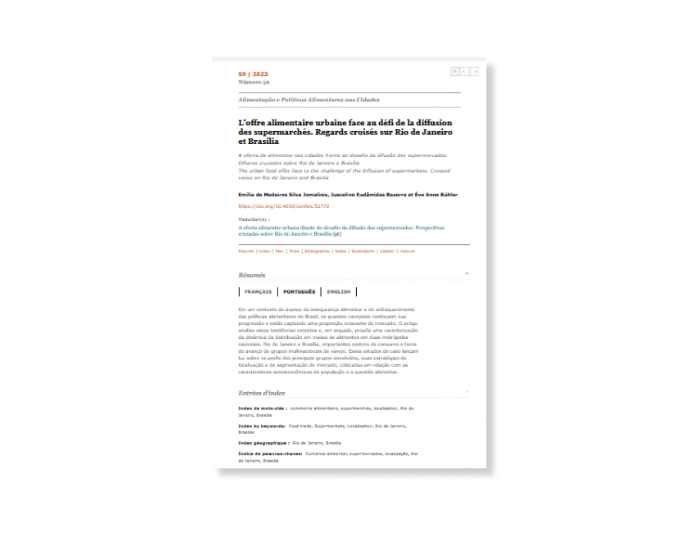 SILVA, E. J. M. ; BEZERRA, Juscelino Eudâmidas ; BUHLER, E. A. . L’offre alimentaire urbaine face au défi de la diffusion des supermarchés. Regards croisés sur Rio de Janeiro et Brasilia. CONFINS (PARIS), p. 1-18, 2023.